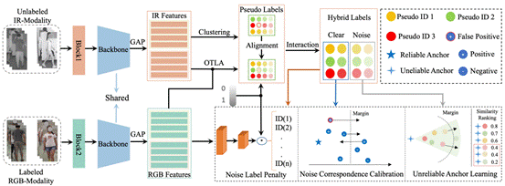 针对传统的跨模态行人重识别因采用全监督导致标注成本高的问题,该论文探索两种实用的半监督设置:单一半监督(仅标注可见光模态)和双重半监督(部分标注两种模态),并提出适用于这两种半监督跨模态行人重识别的双伪标签交互自训练(DPIS)方法。DPIS将两个不同模型生成的伪标签融合成一个混合伪标签。然而,混合伪标签中仍然不可避免地包含噪声伪标签。为了消除噪声伪标签的负面影响,论文设计了三种策略:噪声标签惩罚(NLP)、噪声关联校准(NCC)和不可靠锚的对比学习(UAL)。NLP对噪声标签进行惩罚,NCC校准噪声关联,UAL挖掘难以区分的特征。通过在SYSU-MM01和RegDB数据集上进行大量实验证明,DPIS在这两种半监督设置下取得了非常有效的性能。