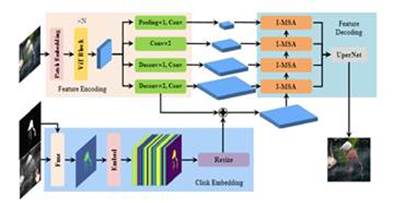 该论文提出了一种高效的图像交互分割方法,称为InterFormer,用于解决现行交互分割流程中存在的模型低并行处理以及计算冗余问题。InterFormer先利用Vision Transformer在高性能设备上并行预处理图像,后基于预处理后的图像特征以及所提出的交互多头自注意力模块(I-MSA)可在低性能的端设备上进行实时的交互分割。经过多个数据集上的实验验证,InterFormer在计算效率和分割质量上均表现卓越,甚至在只使用CPU的设备上,也能实现实时的高质量交互分割。