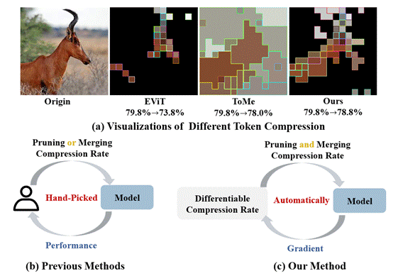 令牌压缩旨在通过修剪(丢弃)或合并令牌来加速大规模视觉变换器(例如ViTs),这是一项重要而具有挑战性的任务。虽然最新的一些方法取得了巨大的成功,但它们需要精心制定压缩率(即要删除的令牌数量),这是一项繁琐的工作,且会降低性能。为了解决这个问题,该论文提出了可微分压缩率(DiffRate),其具有以下特性:首先,DiffRate能够将损失函数的梯度传播到压缩率上,不同的层可以自动学习不同的压缩率,无需额外的开销,而在以前的工作中,压缩率被视为不可微分的超参数;其次,在DiffRate中,令牌修剪和合并可以自然地同时进行,而在以前的工作中它们是独立的;第三,广泛的实验证明DiffRate实现了最先进的性能。例如,将学习到的逐层压缩率应用于现成的ViT-H(MAE)模型,该论文的方法在ImageNet上实现了40%的FLOPs减少和1.5倍的吞吐量提高,而准确率仅下降了0.16%,甚至优于以前经过微调的方法。