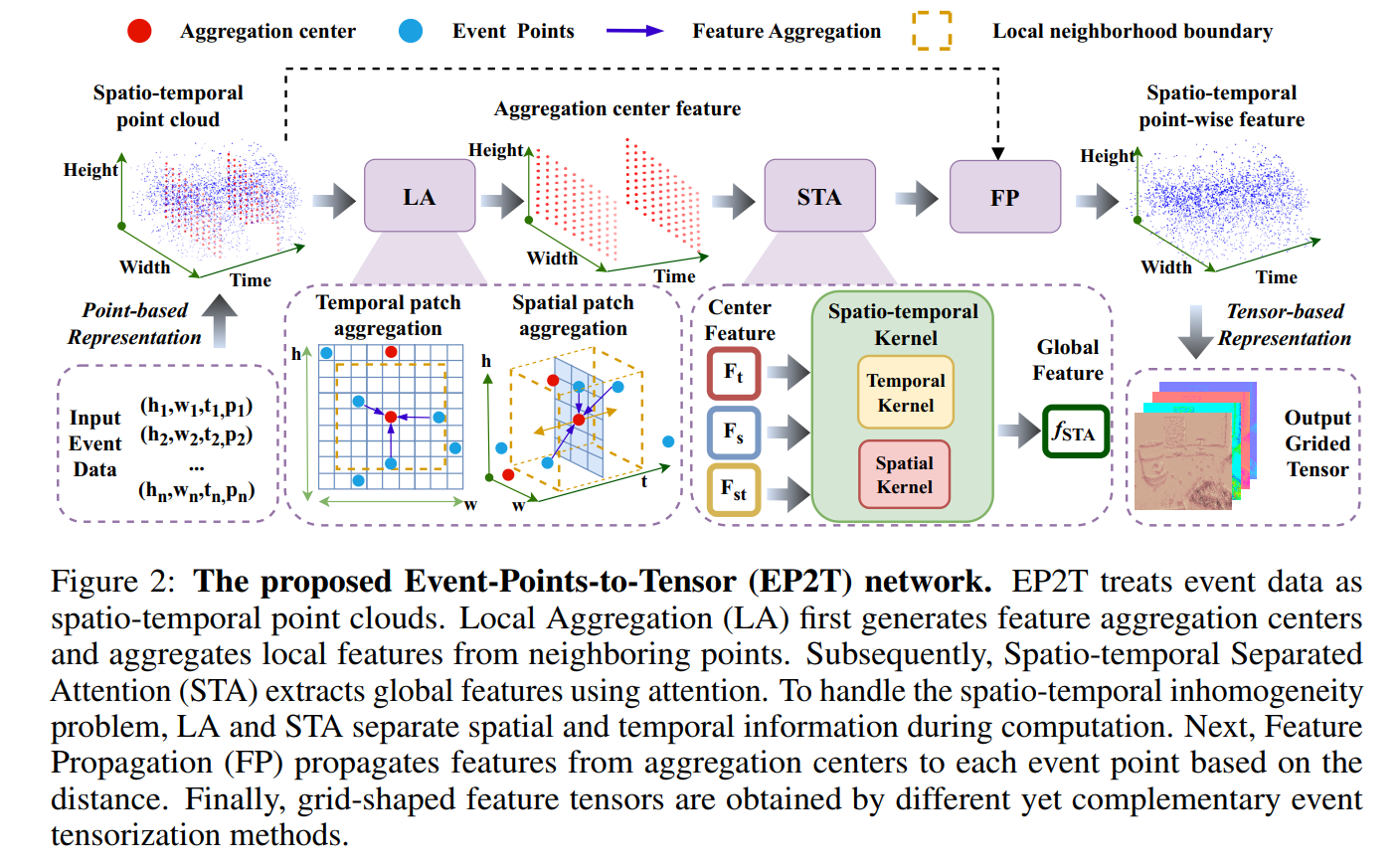 作为一种新型异步视觉传感器,事件相机具有极高的时间分辨率和动态范围,能高性价比地应用于高速、高动态场景。在事件相机中,各像素对超过阈值的光照变化进行异步脉冲响应。这一独特的异步数据流对现有的同步数据处理方式带来了新的挑战。现有方法在事件表示过程中损失了大量的时间细节与时空关联信息,不利于高速、高动态场景。针对这一问题,本论文提出将原始事件相机数据建模为特殊时空点云,使用基于点的学习方法自适应地提取重要的时间细节和时空关联信息,并将其表示为网格化特征向量。论文提出的时空分离注意力机制有效的克服了事件数据中时间与空间维度的不同物理意义、量纲、分布带来的挑战,并且能够以模块化方式嵌入现有事件相机相关算法中。提出的事件学习表示模块可结合后续任务进行端到端学习达到更好的性能。论文在事件-三维点云模型注册任务的多个场景中进行了充分实验,证明了本文表示学习方法的有效性。同时,该方法直接嵌入各类基于事件相机的光流估计、目标识别等任务中同样取得了性能提升,证明了该方法在其他任务中具有泛化性。