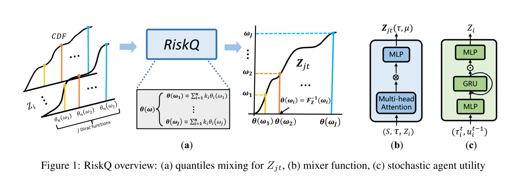 这个工作是信息学院NeurIPS 2022年亮点论文ResQ的扩展和深化。传统的多智能体价值分解算法普遍通过最大化Q值(价值分布的期望)来选取智能体的最优动作。但是在具有高度不确定性的多智能体环境中,由于存在着一些会带来极高/低奖励的小概率事件,因此最大化期望值的算法并不总能保证得到最优解。针对这一问题,本论文对多智能体协同强化学习中常用的个体全局最优化原则(IGM)进行了扩展,提出了风险敏感的个体全局最优化原则(RIGM),并在理论上证明了现有的主流价值分解算法无法满足RIGM原则。之后,本论文提出了RiskQ(基于风险函数的价值分解方法),将联合价值分布建模为个体价值分布的带权分位数混合的形式,通过理论验证其能够满足RIGM原则,且适用于任意扭曲风险指标(Distorted Risk Measure)。论文在悬崖环境、跟车环境以及包含星际争霸游戏的多个场景中进行了充分实验,证明了RiskQ方法的有效性。