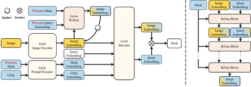 该论文提出了一种称为FocSAM的图像交互分割模型,旨在解决分割一切模型(SAM)在处理复杂样本时遇到的稳定性问题。FocSAM针对SAM的两个方面改进其性能。首先,FocSAM引入了动态窗口多头自注意力(Dwin-MSA)机制,允许模型在交互过程中通过少量的额外计算动态地将图像特征聚焦于目标对象,提高了目标所在区域的特征显著性;其次,FocSAM采用了像素级动态ReLU(P-DyReLU)以更有效地将少量的交互信息与图像特征深度融合,进一步提高模型性能。FocSAM在多个数据集上达到了当前最先进水平,并只需之前最佳方法约5.6%的CPU推理时间。