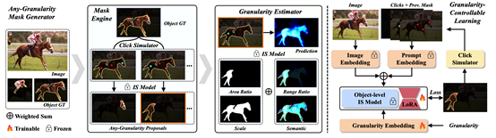 本文介绍了一种新颖的交互式分割方法,称为Granularity-Controllable Interactive Segmentation(GraCo),它通过引入额外的输入参数来实现对预测粒度的精确控制,从而增强了交互系统的定制化,并在解决模糊性的同时消除了冗余。现有的交互式分割(IS)流程分为两类:单粒度输出和多粒度输出。后者旨在缓解前者中存在的空间模糊性。然而,多粒度输出流程的交互灵活性有限,且会产生冗余结果。尽管如此,注释多粒度掩膜的高昂成本以及缺乏具有粒度注释的可用数据集,使得模型难以获得控制输出粒度所需的指导。为了解决这个问题,我们设计了一个任意粒度掩膜生成器,利用预训练IS模型的语义属性自动生成大量的掩膜-粒度对,而无需额外的手动注释。基于这些对,我们提出了一种粒度可控的学习策略,有效地将粒度可控性赋予IS模型。在复杂的对象和部分级别场景的广泛实验中,我们的GraCo与以往的方法相比显示出显著优势。这突显了GraCo成为一个灵活的注释工具的潜力,能够适应多样的分割场景。