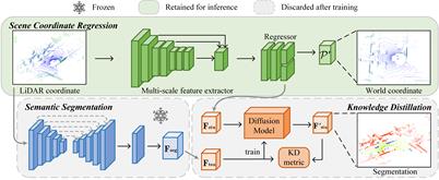 激光雷达定位可估计全球地图中激光雷达点云的姿态。场景坐标回归(SCR)在这项任务中展示了最先进的性能,其中场景被表示为神经网络,网络输出点云中每个点的世界坐标。针对SCR在定位过程中平等对待所有点,忽略了并非所有对象都有利于定位的问题,本文提出了LiSA,首次将语义感知融入SCR以提高定位鲁棒性和准确性。为了避免推理过程中的额外计算或网络参数,将分割模型中的知识蒸馏到原始SCR网络中。LiSA在标准激光雷达定位基准上的性能优越,应用知识蒸馏不仅保持了高效率,而且实现了更高的定位精度。