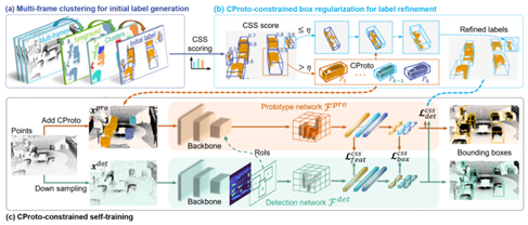 本文针对无监督三维目标检测中伪标签质量低、定位误差大的问题,设计了一个新的基于常识原型的目标检测框架。首先,提出了完整性与形状相似性无监督评分,通过筛选高质量伪标签构建目标常识原型集合。其次,提出了基于原型约束的边界框规范化(CBR),利用原型集合中目标形状先验极大提高了伪标签的质量。最后,提出了基于原型约束的自训练(CST),利用原型集合中目标几何先验显著提高了无监督目标检测的精度。该方法在Waymo Open Dataset,KITTI和PandaSet自动驾驶数据集均达到最好的无监督三维目标检测精度。