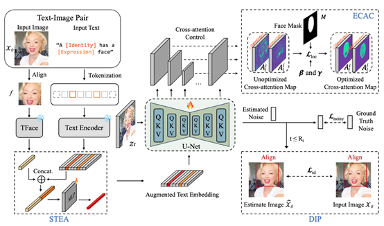本文提出一种基于扩散模型的个性化图像生成方法(PortraitBooth),能够在满足高效率、鲁棒身份保持的条件下实现表情可编辑的文本到图像生成。首先,利用人脸识别模型获得的特征嵌入进行个性化图像生成,降低了计算开销并缓解了身份失真问题。其次,引入动态身份保护策略确保生成图像与原始图像高度相似。最后,融入情感感知的交叉注意力控制用于生成图像中的多样化面部表情,并支持文本驱动的表情编辑。实验结果表明:无论是在单一还是多目标图像生成场景,本文方法明显优于现有方法,获得更好的个性化图像生成效果。