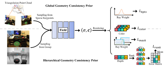 本文在稀疏视图神经辐射场的训练中引入了两种几何约束,以解决360°外向的室内场景中视角变化过大造成的新视图合成质量低的问题。通过在训练早期引入基于图像匹配的全局几何一致性先验来预热神经网络,有效地避免了少样本NeRFs在早期训练陷入过拟合的情况。通过引入几何单目深度估计的层次几何一致性约束,在单视图层面执行分组深度排序约束,在射线权重分布层面执行掩码正则化,进一步强化NeRFs对场景中不同物体位置关系的学习。在ScanNet和Replica数据集上实现了稀疏输入时新视图和深度图渲染的SOTA性能。