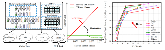 具体来说,该论文首先分析了Transformer结构的MSA和MLP模块的不同属性之间对评估Transformer结构的影响,MSA模块的多样性和MLP模块的显著性度量之间存在量级差异,导致直接结合二者对Transformer结构的评估出现不稳定现象。基于这一研究发现,该论文提出在结合MSA模块的多样性和MLP模块的显著性度量之前,引入当前搜索到的所有Transformer结构在这两个度量上的相对关系,成功将原先搜索过程中的Transformer结构的相互独立状态转换为相互联系的状态,从而实现更准确的Transformer结构评估。为进一步加速在复杂的Transformer搜索空间上的搜索效率,论文构建了创新的模块级进化搜索算法,利用DSS++天然的模块化性质,引导Transformer结构在搜索过程中进行交叉和变异。论文通过实验展示了所提出的T-Razor算法的高效性,在多个复杂Transformer搜索空间上仅需约0.4 GPU个天数即可实现对优秀Transformer子结构的搜索,在ImageNet上相对目前的SOTA方法最高可以提升1.7个百分点。为进一步评估T-Razor,论文扩展了搜索空间以覆盖视觉和NLP任务。对于视觉任务,论文验证了T-Razor在Shunted-ViT搜索空间上的有效性。对于NLP任务,论文在BERT搜索空间上进行了实验,结果表明T-Razor在GLUE的多个NLP数据集上取得了有竞争力的性能,达到81.2的均分。