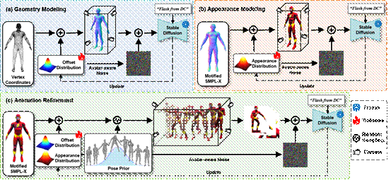本文提出了一个名为X-Oscar的生成模型,该模型能够从文本提示中生成高质量且可动画化的3D虚拟化身。X-Oscar模型采用了一种渐进式的生成范式,包括“几何→纹理→动画”三个核心步骤,并简化了每一步的优化过程。为了解决生成过程中出现的过度饱和问题,本文引入了自适应变分参数(Adaptive Variational Parameter, AVP),使用可训练的自适应分布来表示虚拟化身的几何形状和外观。此外,本文还提出了一种名为化身敏感的分数蒸馏采样(Avatar-aware Score Distillation Sampling, ASDS)方法。这种方法将与虚拟化身的几何形状和外观相关的噪声引入到渲染图像中,进一步增强3D虚拟化身的细节,从而提高其几何形状和外观的质量。本文与多种先进的文本生成3D化身方法进行了详细的定量和定性对比,结果证明了所提出方法的有效性。