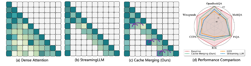 本文提出一种缓存合并 (CaM) 的方法减少大规模预训练模型在推理过程中的缓存开销。 CaM 自适应地将待驱逐的缓存合并到剩余的缓存中,采用一种新颖的采样策略,该策略由废弃位置中注意力分数的突出程度控制。 通过这种方式,CaM 使内存高效的LLM 能够保存关键令牌信息,甚至无需维护其相应的缓存。 本文在各种基准上利用 LLaMA、OPT 和 GPT-NeoX 进行的广泛实验证实了 CaM 在增强内存高效 LLM 性能方面的优势。