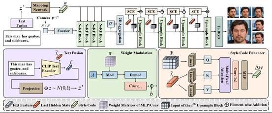 跨模态一致性和多视角语义一致性是文本到3D感知人脸生成与编辑所面临的主要挑战。现有的方法大多存在生成效率低、人脸保真性不高的问题。基于此,本文提出端到端的3D感知人脸生成与编辑模型(