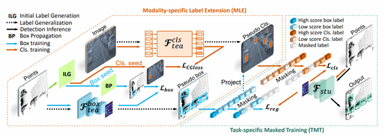 简介:无监督三维目标检测不使用标签监督进行三维目标的检测。现有无监督三维目标检测产生的伪标签无法同时保证目标分类和位置尺寸回归任务的性能,进而导致检测精度下降。为此,本文提出了基于模态和特定任务知识迁移的无监督三维目标检测方法——Motal。Motal首先将伪标签解耦为两组候选框。一组通过运动和图像外观先验提取目标分类信息,另一组通过几何先验提取目标回归信息。然后,Motal使用任务特定的掩码训练方法将所有知识迁移到一个学生网络中,实现分类与回归任务的双重提升。该方法可用于构建高效离线三维目标样本自动标注流程。
