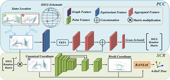 简介: 现有基于隐式表达的激光雷达定位方法对旋转敏感,容易导致定位精度显著下降。针对以上问题,本文提出旋转感知增强的户外点云视觉定位方法-RALoc。RALoc设计了点云规范化模块,通过有效提取等变特征将输入点云转换至规范方向,有效消除旋转对点云定位的干扰。此外,本文构建了双向激光雷达定位数据集(BiLiLo),为评估大旋转变化场景下的定位性能提供基准平台。该方法可显著提升大规模复杂户外场景下激光雷达点云的定位精度。 这项成果攻克了成像方向干扰难题,提升了激光雷达视觉定位的可用性,赋能#城市空间/#无人驾驶/#低空经济应用。