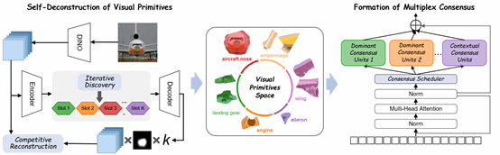 简介: 尽管广义类别发现(GCD)旨在弥合机器与人类在未知类别识别上的能力差距,但现有方法多聚焦于优化目标函数,忽视了视觉识别的组合本质。本文受人类认知过程启发——将物体分解为视觉基元并建立跨知识比较,提出了ConGCD框架。该框架通过语义重建构建面向基元的表示,利用解构过程绑定类内共享属性;同时模拟人类视觉处理中的偏好多样性,设计主导共识单元与上下文共识单元,分别捕获类别判别模式和内在分布不变量,并通过动态共识调度器优化激活路径,最终通过多重共识整合生成预测。实验表明,ConGCD在粗细粒度基准上均展现出有效性,作为共识感知范式实现了对GCD方法的即插即用兼容。