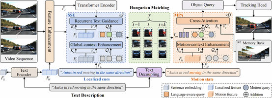 简介: 本文提出了一种新颖的语言引导多目标跟踪方法DKGTrack,通过将自然语言表达解耦为局部描述与运动状态两部分,有效提升了模型对语言细粒度信息的理解能力,从而实现更精确的目标定位与持续跟踪。为增强语言引导下的目标识别能力,本文设计了静态语义增强模块(SSE),通过分层的跨模态特征交互机制强化区域级视觉语言对齐,获得更具判别性的目标表示;同时,提出的运动感知对齐模块(MPA)建模语言中的动态描述与目标轨迹之间的对应关系,提升了跨帧跟踪的一致性。该方法在多个RMOT基准上均取得了优异表现,验证了其在复杂场景中稳健跟踪能力。