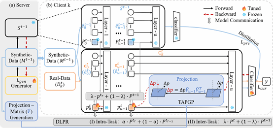 简介: 近来,联邦增量学习因其在保护用户隐私的情况下实现连续学习而受到广泛关注。然而,现有工作常需训练整个模型,这在去中心化的联邦设置下带来较大的模型传输和训练负担。本文提出一种基于提示梯度投影的参数高效的微调方法,在有效缓解灾难性遗忘问题的同时,降低了模型训练和传输开销。该方法以visual prompts为基础,提出了“任务感知的提示梯度投影”和“双层提示回放”两个主要模块,前者有效避免对已学习知识的破坏,后者有效利用知识复盘,相辅相成,有针对性地缓解了灾难性遗忘问题。实验结果表明,我们的方法仅以基准方法1%的训练参数量,在相同主干框架下取得了5%的性能提升。