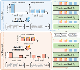 简介: 视觉提示学习旨在通过仅微调轻量化提示使预训练模型适应于下游任务。然而,现有提示方法通常在不同任务下不加区分地使用固定的提示分布,忽略了每个预训练层的提示需求在不同任务中存在显著差异。为此,本文提出了一种全新的视觉提示学习框架——PRO-VPT,旨在通过一个嵌套优化定义来实现提示分布的动态自适应。具体而言,本文基于嵌套优化定义设计了一种提示重定位策略,包含两个优化步骤:首先识别并剪枝惰性提示,随后通过决策将这些提示分配至最优层。通过将提示重定位结合于提示学习中,PRO-VPT能够以优化的形式动态学习各任务的最优提示分布,从而充分发挥提示的潜力。实验结果表明,PRO-VPT在多个下游任务中均显著优于现有方法。