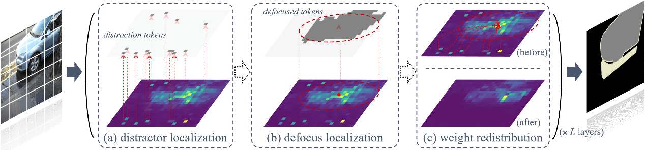 开放词汇语义分割通过像素级的视觉-语言对齐技术,将类别相关提示与对应像素建立关联。其核心挑战在于提升多模态密集预测能力——尤其是像素级的多模态对齐性能。现有方法虽借助CLIP的视觉-语言对齐能力取得显著成果,却鲜少从解释性机制视角探究CLIP在密集预测任务中的性能边界。本研究系统揭示了CLIP的内部机制,发现关键现象:类比人类分心行为,CLIP会将大量注意力资源从目标区域转移至无关token。分析表明,这些干扰token源于维度特异性过激活现象,过滤此类token可显著增强CLIP的密集预测性能。据此,本文提出ReFocusing CLIP方法(简称RF-CLIP),这种无需训练方案通过模拟人类"分心-再聚焦"行为,将注意力从干扰token重定向至目标区域,从而提升CLIP多模态对齐的精细度。本方法在八大基准测试中刷新最先进性能,同时保持高效推理效率。