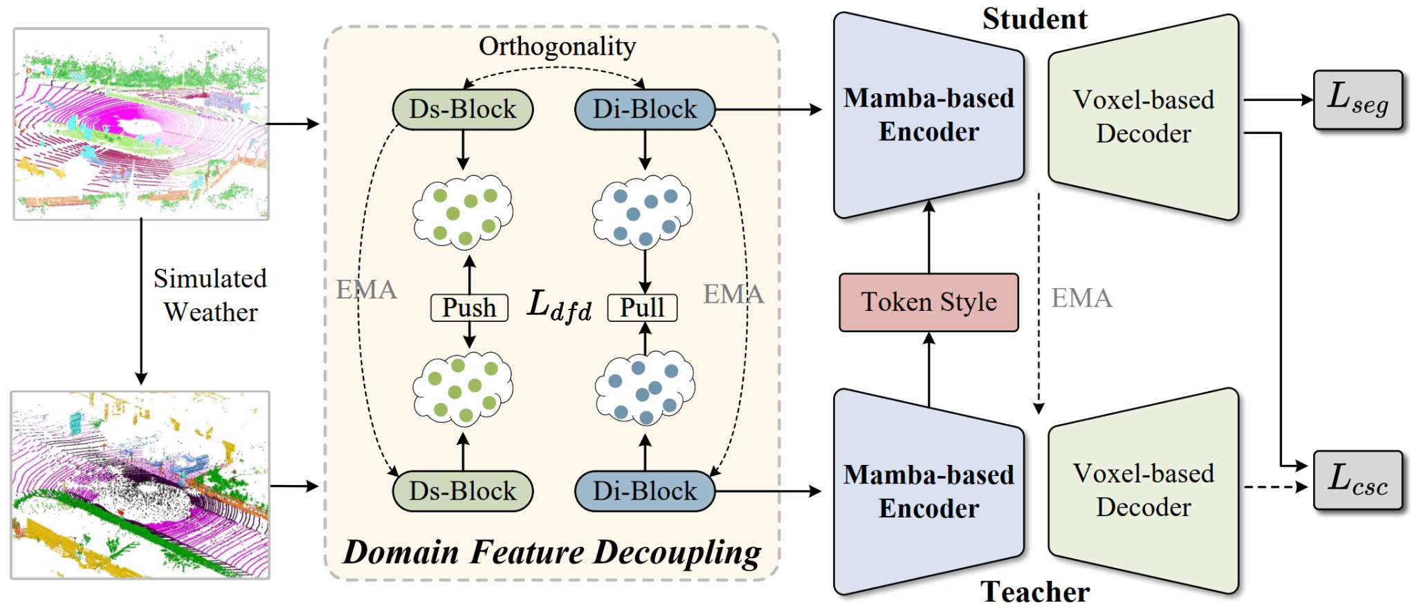 该论文探索了恶劣天气下,空间噪声的注入影响LiDAR点云的反射率,加剧域分布差异化,降低3D模型泛化性能的问题。当前方法主要依赖于3D稀疏卷积架构处理点云数据。但受限于局部感受野,难以有效捕获不同稀疏度点云的全局几何特征,导致跨域迁移能力受限。因此,本文创新性地将状态空间模型集成到3D稀疏卷积的体系结构中,序列建模所有特征以学习域不变表示。首先,设计领域特征解耦模块,在序列建模之前将特征分离为域不变特征和域特定特征,为后续跨域表征对齐奠定基础。其次,设计基于Mamba的3D编码器,将状态空间模型与3D稀疏卷积块集成,实现对体素化点云的全局序列化建模,突破局部感受野限制。最后,引入风格增强模块,捕获输入数据的内在属性,强化域不变表示的鲁棒性。该方法的提出有效缓解了恶劣天气下点云分布偏移导致的性能退化问题。实验结果证明,在场景SemanticKITTI→SemanticSTF和SynLiDAR→SemanticSTF下实现点云域泛化和域自适应的突破性进展,显著超越当前最先进的方法。