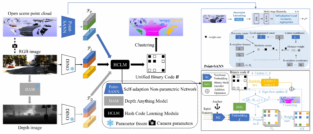 本文针对无监督、无需训练的LiDAR点云语义分割问题,提出了一种新的跨模态哈希学习框架xMHashSeg。现有方法在面对新场景或新类别时通常需要大量重新训练,依赖标注数据或模型微调。为解决这一挑战,xMHashSeg充分利用2D图像与3D点云的互补信息,在完全不使用标签、不进行任何训练的前提下实现语义分割。本文设计了一种新型非参数网络Point-SANN,用于从原始LiDAR点云中提取对密度变化鲁棒的3D特征。为有效融合多模态特征,论文引入哈希码学习模块,将不同模态特征投影到统一的哈希空间中,通过协同离散表示学习和二值聚类结构优化,获得一致且判别性强的哈希编码用于聚类分割。在多个公开数据集上的实验验证了方法的优越性。