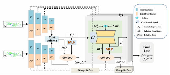 基于学习的激光雷达里程计方法通过端到端回归相对位姿展现了优越性能,然而当迁移到新场景时性能显著降低。为此,本文提出一种简洁而高效的激光雷达里程计框架RCP-LO。首先,创新性地将相对位姿表示为相对坐标并基于几何验证进行求解,避免了过度简化的位姿表示。其次,为捕捉动态环境中遮挡点云相对位姿估计固有的不确定性,引入去噪扩散模型进行相对坐标采样,在增强鲁棒性的同时生成合理位姿假设。还设计了可微分加权奇异值分解模块,通过单次前向传播即可实现高效位姿估计。实验表明,仅在KITTI数据集上进行训练,在KITTI-360、Ford和Oxford数据集上均达到与当前最优学习方法相当的精度。