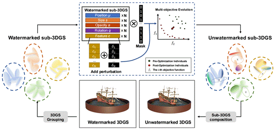 3D高斯溅射作为一种新兴的3D场景表示和重建技术,凭借其高保真度和实时渲染能力,在电影、游戏、虚拟现实等领域展现了广阔的应用前景。随着3DGS模型的广泛应用,其版权保护问题日益凸显,多种数字水印技术被提出用于嵌入版权信息。然而,这些水印技术的鲁棒性(即抵抗潜在攻击的能力)尚未得到充分的研究。针对这一研究空白,该论文首次提出了一个通用的3DGS水印黑盒攻击框架GMEA(Group-based Multi-objective Evolutionary Attack)。该框架将攻击过程构建为一个大规模多目标优化问题,旨在同时实现两个相互冲突的目标:最大化水印去除效果与最小化视觉质量损失。在黑盒设置下(即攻击者对水印内容、嵌入和检测过程一无所知),GMEA创新性地设计了一个间接目标函数:通过最小化卷积网络提取特征的标准差,使特征图变得“平坦”且不具信息量,从而“致盲”下游的水印检测器。此外,为解决3DGS模型(通常包含数百万个高斯核)带来的巨大搜索空间,GMEA采用了一种基于分组的优化策略,利用聚类算法将模型划分为多个独立的子优化问题,显著提高了攻击效率。大量的实验结果表明,GMEA框架不仅能有效去除当前主流的一维和二维3DGS水印,同时能在攻击后保持极高的模型视觉保真度。该研究不仅揭示了现有3DGS版权保护方案中存在的关键漏洞,也为未来开发更安全、更鲁棒的水印系统提供了重要的基准和研究方向。
