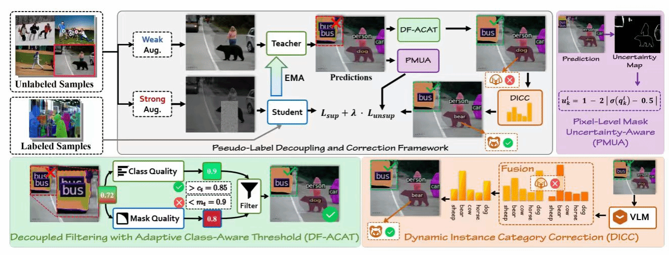 半监督实例分割(SSIS)旨在利用有限的标注数据与大规模未标注数据实现实例级预测,但其性能高度依赖伪标签质量。现有方法通常将类别置信度与掩码质量耦合为单一分数进行过滤,容易造成语义准确性与空间精度之间的冲突,从而引入噪声伪标签并限制模型上限。