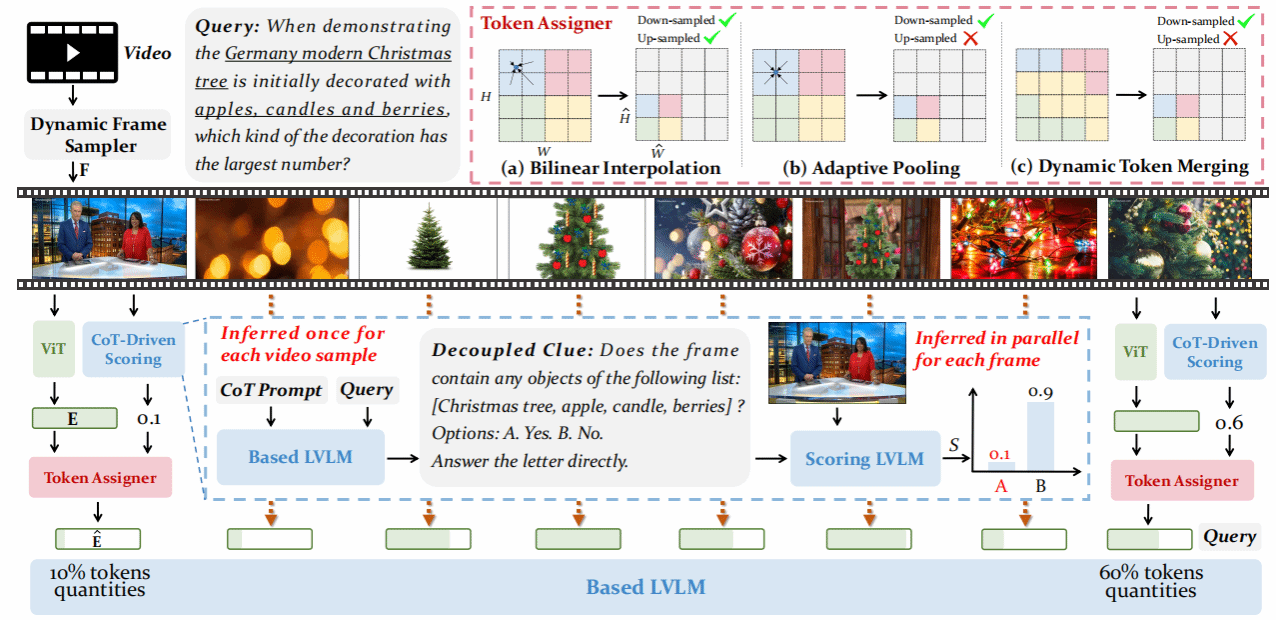 本文提出了一个名为 KTV的免训练的视频理解框架,通过“两级筛选”让通用图像-文本大模型更高效地看视频:第一步,它不用问题信息,而是用 DINOv2 提取所有帧的特征并做 K-means 聚类,从中选出能代表整段视频、且内容多样的问题无关关键帧以避免落入“语义陷阱”,从而减少时间上的冗余;第二步,在每个关键帧内,再根据与[CLS] token的重要性得分和与其他视觉token的冗余度共同计算评分,只保留最有信息量、又不过于重复的关键视觉 token,并结合CLIP评估与问题的相关性,为更相关的帧分配更多token,最终将这些精简后的视觉token与文本一起输入LLaVA等VLM进行推理。实验表明,在多项多选视频问答基准上,KTV在仅用极少视觉token(例如60分钟、10800帧的视频只用 504 个视觉 token)的情况下,仍优于现有免训练的视频理解方法,部分设置甚至超过一些需要专门训练的视频大模型,显著降低了推理时长和算力需求。
