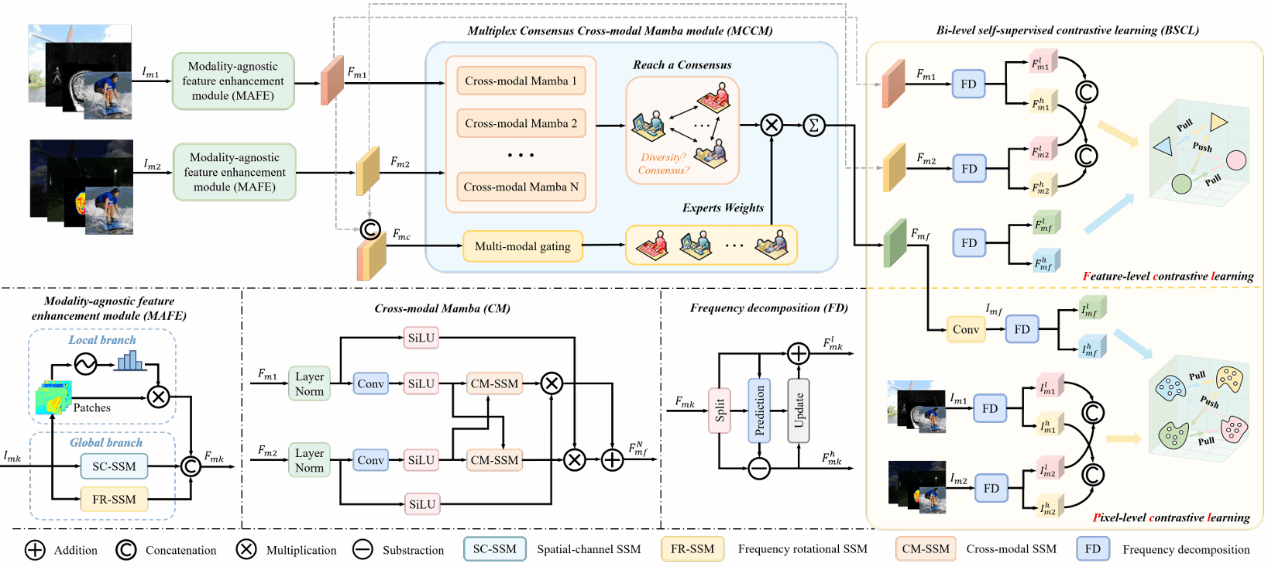 图像融合通过整合不同模态的互补信息,生成高质量的融合图像,从而提升目标检测、语义分割等下游任务的表现。不同于面向单一任务的专用融合方法,通用图像融合旨在不增加复杂度的前提下,实现更广的任务范围并提升性能。为此,本文提出一种用于通用图像融合的自监督多路共识 SMC-Mamba框架。首先,该框架创新性地设计了模态无关特征增强(MAFE)模块,通过自适应门控保留局部精细细节,并以空间通道与频率旋转扫描强化全局表征。其次,多路共识跨模态 MCCM 通过专家间动态协作与跨模态互扫,高效整合多模态的互补信息:一方面鼓励专家形成多样的特征偏好与融合策略,另一方面促使被激活专家向统一表征收敛,从而为图像融合及下游任务提供更可靠的结果。此外,本文提出一种新颖的双层自监督对比正则化损失(BSCL),在不增加模型复杂度的前提下,同时在特征层与像素层增强高频信息,并进一步提升下游视觉任务的性能。实验结果表明,该方法在红外可见光、医学、多焦点与多曝光等多类融合任务及相关下游视觉任务上均优于SOTA方案。