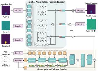 多相流系统由于其复杂的动态行为、场的不连续性以及相间相互作用,对传统数值求解器提出了巨大的计算挑战。尽管神经算子为这类问题提供了高效的替代方案,但在这些系统中往往难以实现高分辨率的数值精度。这一局限主要源于多相流固有的空间非均匀性以及高质量训练数据的稀缺。在本研究中,我们提出了一种新的框架——界面信息感知神经算子(Interface Information-Aware Neural Operator,简称 IANO),该框架通过显式引入界面信息作为物理先验来提升预测精度。IANO 架构包含两个关键组件:(1)界面感知的多函数编码机制:该机制联合建模多个物理场与界面信息,从而捕捉界面处的高频物理特征。(2)几何感知的位置编码机制:该机制进一步建立界面信息、物理变量与空间位置之间的关系,使模型即便在低数据场景下也能实现逐点的超分辨率预测。实验结果表明,IANO 在多相流模拟中相较于基线模型在精度上提升了约 10%,并在数据稀缺和噪声扰动条件下保持了良好的鲁棒性。