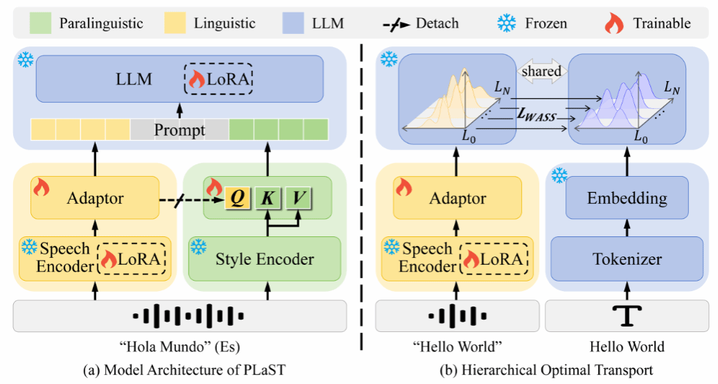语音翻译(Speech Translation, ST)旨在将源语言语音直接翻译为目标语言文本。然而,语音信号中除语言内容外,还包含语气、情感、强调等副语言线索(paralinguistic cues),这些信息可能显著影响甚至改变语义解读,从而导致不同的翻译结果。现有ST模型普遍缺乏对副语言信息的直接且充分建模,难以全面感知语音中的语用细微差别,限制了翻译性能的进一步提升。为此,本文提出了一种副语言感知的语音翻译框架(ParaLinguistic-aware Speech Translation, PLaST),通过双分支结构显式分离并融合语言与副语言信息。具体而言,PLaST利用语音编码器与风格提取器分别生成语言表征和副语言表征;为进一步获得与文本对齐的纯净语言表征,引入分层最优传输(Hierarchical Optimal Transport)机制对大语言模型解码器的层间输出进行约束;随后,设计基于注意力的检索模块(Attention-based Retrieval, AR),以语言表征为查询,动态检索并精炼副语言信息,实现语义理解与翻译生成的联合引导。在副语言敏感基准ContraProST上的实验表明,PLaST显著优于现有强基线方法;同时在标准语音翻译数据集CoVoST-2上也展现出良好的泛化能力,验证了该方法的有效性与实用性。