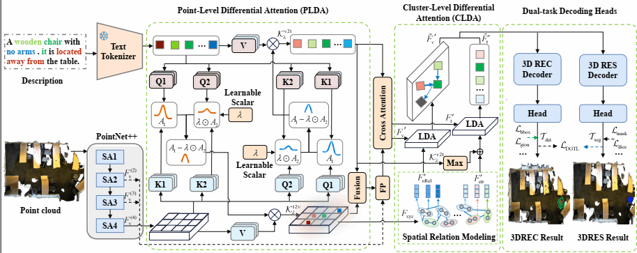 针对当前3D视觉定位(3DVG)方法在多目标复杂场景下面临的两大关键瓶颈——隐式定位线索解析能力不足与空间匹配关系干扰抑制缺失,本文提出一种基于点-簇协同优化的跨模态差分学习网络(PC-CrossDiff)。该方法通过点层级跨模态差分注意力,自适应提取文本描述中的隐式定位线索,有效缓解文本潜在语义丢失问题,显著增强模型在多目标场景下的定位判别能力;同时,引入簇级差分注意力,通过差异化建模空间匹配关系并动态抑制无关干扰,解决定位关联关系的选择性提取难题。通过点级局部语义感知与簇级全局关系筛选的协同建模机制,PC-CrossDiff统一建模3D指代表达式理解(3DREC)与3D指代表达式分割(3DRES)任务。该方法无需复杂的投影流程,在保持高推理速度的同时,显著提升了多目标复杂场景下的定位精度与鲁棒性,为3D视觉定位提供了一种新的双任务学习范式。