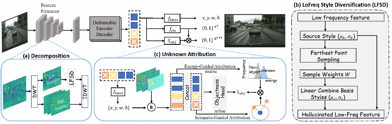 开放集目标检测(Open-set Object Detection, OSOD)的目标是在识别已知类别目标的同时,定位先前未见过的实例。然而,真实场景中往往同时存在域偏移与未知类别的问题。现有的 OSOD 方法通常忽略域偏移,依赖仅在源域上训练的特征表示。这些表示往往将域特定的风格与语义内容纠缠在一起,从而削弱了模型对未知域和未知类别的泛化能力。为应对这一挑战,我们提出了一个统一框架——Decompose and Attribute (DOAT),旨在将域特定风格与语义结构解耦,从而实现更具泛化能力的目标检测。DOAT 通过基于小波的特征分解,显式地分离并建模了域偏移与类别偏移。针对域偏移,DOAT 在风格子空间内对低频分量进行扰动,以模拟多样化的域特征;针对未知类别的发现,利用高频分量,通过归因机制融合小波能量与语义距离,以估计目标性得分。