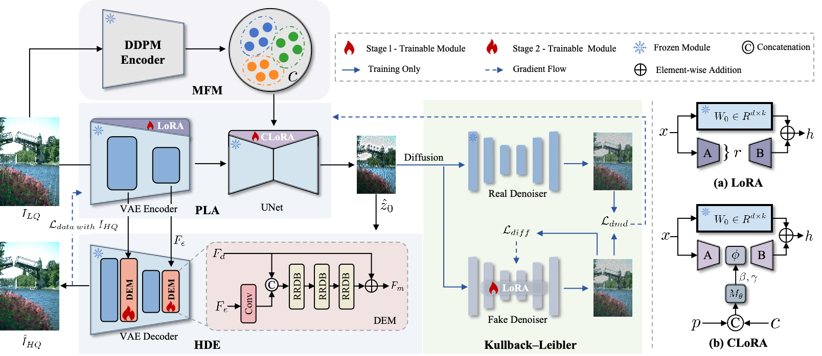扩散模型在一体化图像恢复(AiOIR)中展现出强大的潜力,尤其擅长生成丰富的纹理细节。现有的 AiOIR 方法通常需要重新训练扩散模型,或者在预训练扩散模型的基础上加入额外的条件引导进行微调。然而,这些方法往往面临推理成本高、对多样化退化类型适应性有限的问题。本文提出了一种高效的 AiOIR 方法——Diffusion Once and Done(DOD),旨在仅通过 Stable Diffusion(SD)模型的一步采样就实现优异的恢复性能。具体而言,首先引入了多退化特征调制机制,通过预训练的扩散模型来捕获不同的退化提示;随后,参数高效的低秩条件适配方法将这些提示进行融合,从而使 SD 模型能够通过微调适应多种退化类型。此外,本文在 SD 的解码器中集成了高保真细节增强模块,以提升结构与纹理细节。实验结果表明,本文方法在视觉质量与推理效率方面均优于现有基于扩散模型的图像恢复方法。