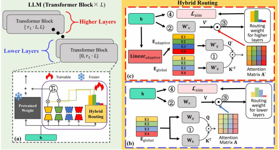 本文提出了一种名为HotMoE 的异构路由混合LoRA专家模型框架,旨在解决多任务指令微调中专家利用效率低和专家与任务适配不足的问题。HotMoE 引入分层混合路由机制,在浅层促进跨任务协作与泛化,在深层实现任务语义与专家能力的精确对齐。此外,提出相似度引导的辅助损失,增强专家专化性与路由确定性。实验结果表明,HotMoE 在多个自然语言理解与大模型生成任务上显著优于现有多任务微调方法,有效缓解了多任务学习中的“跷跷板效应”。