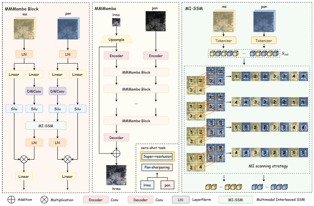 遥感全色锐化(Pan-sharpening)旨在将高分辨率全色(PAN)与低分辨率多光谱(MS)融合,生成高分辨率多光谱图像。传统 CNN 方法多依赖通道拼接与固定卷积算子,难以适应多样的空间与光谱变化;而 Transformer 虽能实现全局交互,但计算开销大,且易弱化细粒度对应关系,难以刻画复杂语义关联。为此,本文首次将上下文条件(in-context conditioning)范式引入全色锐化,并提出跨模态上下文融合框架 MMMamba。该方法基于 Mamba 架构,在保持强跨模态交互能力的同时实现线性计算复杂度。其次,为充分释放上下文条件的潜力,本文设计了一种新颖的多模态交错(MI)扫描机制,通过在空间上将PAN和MS的相应信息单元(token)交错排列,促进了两种模态间高效、直接的双向信息交换。此外,该框架具备卓越的零样本泛化能力:仅针对全色锐化任务训练后,模型无需任何微调即可直接应用于多光谱图像的超分辨率任务。在多个基准数据集上的大量实验证明,MMMamba在全色锐化和零样本图像增强任务中均一致性地优于现有的SOTA方法。