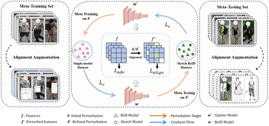 素描行人重识别旨在将手绘草图与 RGB 图像进行匹配,但由于模态差异显著且标注数据稀缺,该任务仍面临巨大挑战。为此,本文提出KTCAA,一个理论启发的、适用于小样本跨模态迁移学习的框架。从泛化误差上界的角度出发,识别出影响目标域误差的两个关键可控因素:(1)域差异性,即源域与目标域在特征空间中的分布对齐难度;(2)扰动不变性,即模型对跨模态变化的鲁棒性。针对上述挑战,本文设计了两个相应的模块:(1)对齐增强模块,通过对 RGB 图像进行局部草图风格变换,引入细微但有意义的特征扰动,从而引导模型逐步对齐不同模态的分布;(2)知识迁移催化器,通过生成最坏情况下的模态扰动,并强制保持特征输出一致性,以提升模型的扰动鲁棒性。上述两个模块在元学习框架下联合优化,使得模型能够有效地将RGB数据集中丰富的知识迁移到素描场景。多项基准测试结果表明,KTCAA 在数据有限和跨模态迁移条件下均实现了领先的识别性能和出色的泛化能力。