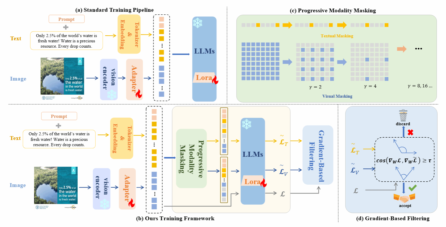 尽管多模态大语言模型(MLLMs)在跨模态理解方面表现突出,但它们在处理噪声、缺失或模态错配的现实场景时表现出两类重要不足:一是弱化的单模态语义建模,即为追求跨模态关联而牺牲了对单一模态中细粒度线索的敏感度;二是模态偏置,某些MLLM倾向于过分依赖文本或视觉,从而忽视另一模态的关键信息。为此,本文提出了 AimKP 框架,以增强MLLM的单模态理解能力并保持跨模态对齐。AimKP包含两个核心部分:(1)渐进模态遮蔽,通过在训练过程中逐步遮蔽模态信息,迫使模型从被破坏的输入中提取细粒度特征;(2)基于梯度的筛选,通过梯度相似性动态剔除噪声样本,防止其影响核心跨模态学习。该方法首次系统性地将MLLM适配至MKP任务,实验结果也表明AimKP在多模态关键词生成任务中显著提升了模型的单模态理解能力和整体鲁棒性,取得了最新的最优性能。