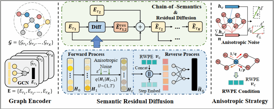 异构图(Heterogeneous Graphs)在真实场景中广泛存在,但其多类型关系往往伴随噪声不均、语义跳变复杂等问题,导致现有方法难以准确捕获跨关系的语义演化。尤其在扩散框架下,传统各向同性高斯噪声无法反映异构图固有的结构方向性,易造成语义模糊与结构偏移。为此,我们提出ARDiff,一种结合语义残差建模与各向异性扩散的新型异构图学习框架。具体而言,ARDiff 包含两个核心设计:(i)语义残差扩散:基于从高噪声关系到低噪声关系的“语义链”,构建逐级残差去噪机制,以捕获关系间的细粒度语义差异;(ii)各向异性扩散策略:在前向扩散中引入结构与语义先验,生成方向性噪声;在反向扩散中结合随机游走位置编码,引导模型保持拓扑一致性。实验结果显示,ARDiff 在链接预测与节点分类任务上均显著超越现有方法,展现出更强的异构语义建模能力。