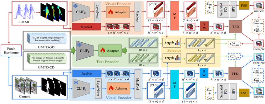 简介:步态识别在远距离和非侵入式身份验证场景中具有显著优势。由于激光雷达和RGB相机等异构传感器的数据间存在模态鸿沟,跨模态步态识别极具挑战性。为此,本文提出了一种文本引导的跨模态特征解耦网络TCFDNet,利用感知模态的文本先验作为语义锚点来引导特征学习。首先,利用大语言模型构建步态模态文本字典(GMTD)以生成跨模态与视角的丰富语义描述,并采用基于CLIP的多粒度特征编码器在统一的视觉-语言空间中对齐视觉与文本特征;其次,设计文本引导的特征解耦(TFD)模块,选取最佳匹配文本重建模态特定表示,并通过残差分解与正交性约束提取模态共享特征;最后,提出特征稳定性增强(FSE)模块以建模空间和通道相关性,并引入跨模态块(Patch)交换策略,有效提升了解耦特征的鲁棒性与模型的泛化能力。在SUSTech1K和FreeGait数据集上的实验表明,TCFDNet达到了全新的SOTA性能。