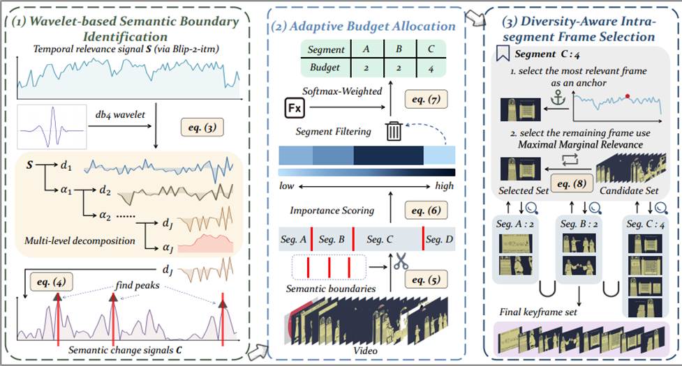 在长视频理解任务中,由于视频帧冗余度高且大模型上下文受限,高效的帧选择至关重要。现有方法通常倾向于选取孤立的查询相关帧,忽视了视频整体的叙事连贯性,且极易受到高频噪声的干扰。为此,本文提出了一种全新的无训练帧选择框架 WFS-SB。该方法创新性地引入信号处理视角,利用小波变换过滤查询-帧相似度信号中的噪声,精准识别语义边界,将长视频分割为语义连贯的“章节”片段。随后,通过自适应预算分配与段内多样性采样策略提取关键帧,在保留视频叙事完整性的同时兼顾重要性与多样性。实验表明,WFS-SB 显著提升了主流大模型在 VideoMME、MLVU 等长视频基准测试上的表现,最高提升达 9.5%,为长视频理解提供了一种全新的结构感知型帧选择范式。