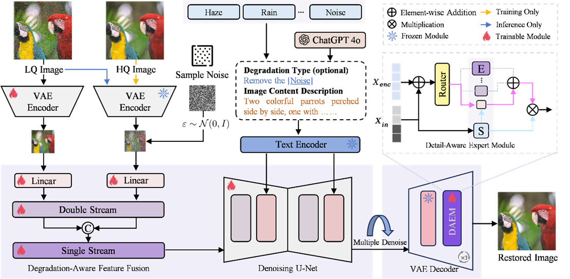 预训练潜在扩散模型(如Stable Diffusion)展现出的卓越建模能力,有望为全能图像修复(All-in-One Image Restoration, AiOIR)任务提供强大的生成先验支持。为了在统一架构下精准适配多种退化并弥补恢复过程中的细节丢失,本文提出了 UniLDiff 框架。该框架通过引入退化感知特征融合机制(DAFF)与细节感知专家模块(DAEM),深度解锁扩散先验的修复潜力:DAFF通过解耦融合和自适应调制将低质量特征动态注入去噪迭代过程,实现对多钟退化的隐式建模与空间自适应引导;DAEM通过专家路由机制动态激活特定分支,利用多尺度特征补偿潜在空间压缩引起的信息损耗,显著提升纹理与细节的重建精度。实验结果表明,UniLDiff在多项修复任务及零样本未知退化场景下均取得了先进的性能,验证了扩散先验在通用图像修复领域中的巨大应用潜力。