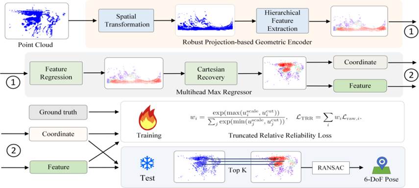 激光雷达重定位能够在复杂三维环境中提供精确的六自由度位姿估计。现有基于学习的回归方法通过直接预测全局位姿来提供高效解决方案,无需显式存储地图。然而,这类方法在复杂场景中往往表现欠佳,主要原因是它们对所有预测点采用同等权重处理,导致容易受噪声和外点影响。本文提出一种基于几何编码器增强的鲁棒激光雷达定位方法LEADER。具体来说,提出一种基于投影的鲁棒几何编码器架构,通过捕获多尺度几何特征来增强几何表示的描述能力;此外设计了TRR损失函数,建模点的可靠性并抑制不可靠预测的影响。在Oxford RobotCar和NCLT数据集上的实验表明,LEADER方法优于SOTA方法,分别降低了24.1%和73.9%的定位误差。