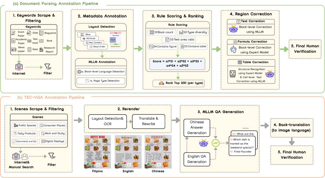 本文聚焦多语言文档与场景文本理解在检索、金融和公共服务等应用中的关键作用,指出现有基准多偏向高资源语言,难以在真实多语言环境下评测模型能力。针对东南亚地区语言高度多样、书写系统复杂且文档类型差异显著带来的评测挑战,本文提出了多语言基准 SEA-Vision,面向 11 种东南亚语言,联合评测文档解析(Document Parsing)与以文本为中心的视觉问答(TEC-VQA)。本文构建了两类核心数据:其一为 15,234 页文档解析数据,覆盖 9 类代表性文档,并提供页面级、块级、行级的层次化标注;其二为 7,496 组 TEC-VQA 问答对,系统考察文本识别、数值计算、对比分析、逻辑推理与空间理解等能力。为在多语言、多任务场景下实现可扩展的高质量标注,本文设计了面向文档解析与 TEC-VQA 的混合式标注流水线,结合自动化筛选与评分、基于 MLLM 的辅助标注以及轻量级母语者核验,在显著降低人工成本的同时保证标注质量。进一步的评测结果表明,现有多种主流多模态模型在低资源东南亚语言上的性能明显下降,揭示了多语言文档与场景文本理解的显著差距。本文认为,SEA-Vision 将为推动文档与场景文本理解的全球化研究提供新的视角,促进该领域的持续发展。