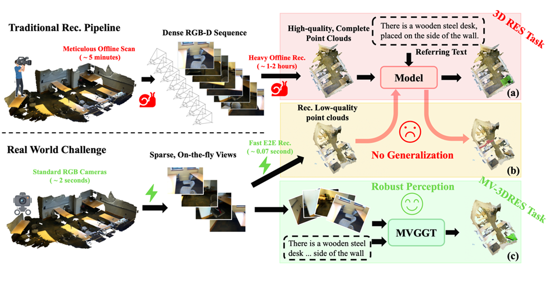 针对机器人等移动设备在稀疏视角下 3D 感知难、延迟高的痛点,研究团队提出了一种全新的多视角 3D 指代对象分割(MV-3DRES)框架——MVGGT。该框架摒弃了传统低效的“先重建再分割”模式,通过端到端的双支路设计将语言深度融入几何推理,并创新性地利用 PVSO 优化算法解决了稀疏信号下的梯度稀释问题;配合同步推出的 MVRefer 标准基准,MVGGT 在实现高精度定位的同时显著提升了推理速度,为复杂真实场景下的多模态空间感知树立了新的性能标杆。该项目已开源,项目主页为:https://mvggt.github.io/
