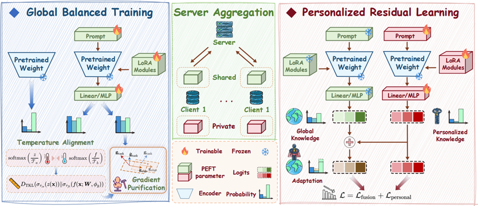 在个性化联邦学习中,利用基础模型是应对客户端数据异构性的重要途径。然而,真实场景下往往同时面临非独立同分布与长尾分布的双重挑战。在异构长尾数据上直接微调会严重侵蚀基础模型原生的零样本知识平衡性;同时,现有的融合式个性化方法不仅无法解决该问题,还会将这种全局偏差放大并传递给客户端,进一步损害识别性能。为此,本文提出一种新的个性化联邦学习方法FedPuReL。该方法首先对下游任务的更新梯度进行提纯,剔除对模型原生平衡性具有负面影响的梯度,使全局模型保持良好的平衡性;进一步地,构建残差式个性化模型,使客户端在平衡的全局模型基础上进一步学习个性化知识,从而在适配本地数据的同时兼顾知识平衡性。实验结果表明,该方法在多个联邦长尾基准数据集上能够同时提升全局模型与个性化模型的性能表现,显著优于现有SOTA方法。