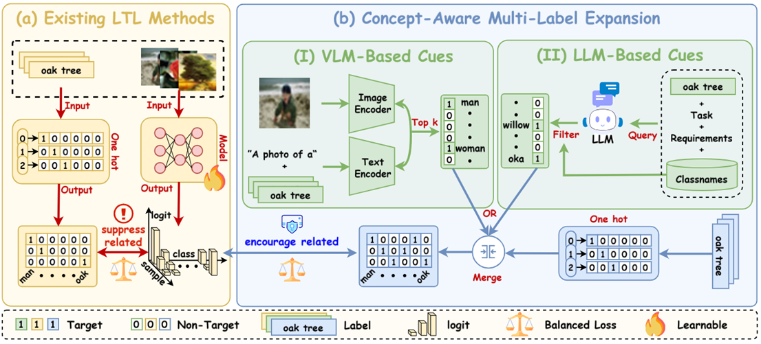在真实世界的识别任务中,数据通常呈现长尾分布,即少数头部类别样本充足而大量尾部类别样本稀缺。尽管近年来通过微调基础模型在长尾学习中取得了显著进展,但现有方法大多仅关注缓解类别分布不平衡带来的偏置问题,而忽视了由单标签监督互斥性引发的类别概念混淆现象,导致相关类别之间特征共享受限、头部类别主导效应增强,从而破坏类别间判别结构。针对这一问题,本文提出概念感知多标签扩展方法CUE,通过引入多标签概念信号以恢复类别间语义关系。具体而言,CUE结合零样本CLIP提取的实例级视觉线索与大语言模型生成的类别级语义线索构建概念集合,并分别通过加权的BLA辅助损失进行建模,与基础LA损失联合优化。实验结果表明,CUE在多个长尾基准数据集上实现了更加均衡且具有竞争力的整体性能,优于近期先进方法。