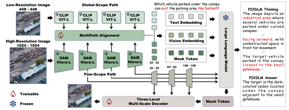 推理分割最近已从地面场景扩展到遥感图像领域,这给无人机影像带来了全新的挑战,如倾斜视角、超高分辨率以及目标极端尺度变化等问题。针对这些无人机数据的特有属性,本文定义了无人机推理分割任务,并将其语义需求归纳为三个层次:空间推理、属性推理与场景级推理。基于这一框架,本文构建了首个大规模无人机推理分割基准DRSeg,其包含了1万张高分辨率航拍图像,并提供了涵盖上述三类推理任务的思维链问答标注。此外,论文进一步提出PixDLM,这是一种像素级多模态大语言模型,配备双路径视觉编码器,能够在保持强大全局语义对齐的同时保留细粒度的高分辨率线索。在DRSeg上的大量实验表明,与现有其他多模态模型相比,PixDLM实现了更优的语义一致性和空间定位精度,为无人机推理分割建立了统一高效的基准。