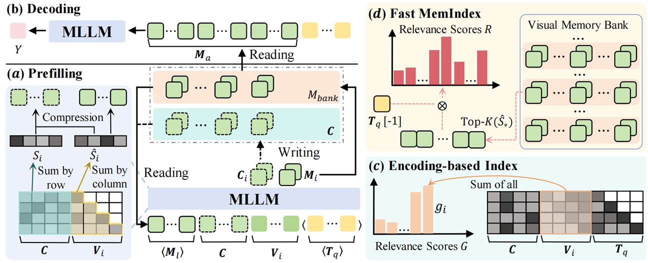 本文针对多模态大语言模型在长视频理解任务中因输入长度限制和计算开销过大而难以处理海量帧的问题,提出了名为 FlexMem (Flexible Memory) 的新型视觉记忆机制框架。该工作模拟人类看视频时形成连续记忆与回忆关键片段的行为,通过双路径压缩设计将视觉 KVCache转化为传递历史信息的上下文记忆和保留显著特征的局部记忆,实现了在有限显存下对无限长视频序列的迭代处理。同时,针对流式任务中的推理效率瓶颈,论文进一步提出了 MemIndex 快速索引机制,通过自适应选择代表性缓存层与构建轻量化索引,显著降低了从海量信息中检索的计算成本。实验表明,FlexMem实现了使用单张消费级显卡便能处理超过千帧甚至无限长的视频流。其现实意义在于:FlexMem 作为一种无需训练、即插即用的通用组件,不仅极大提升了现有 MLLM 对长达数小时视频的全局理解与细粒度检索能力,且凭借其高效的内存管理特性,证明了通往无限长视频理解的钥匙,不在于无限扩张的上下文窗口,而在于更聪明、更拟人的记忆机制 。