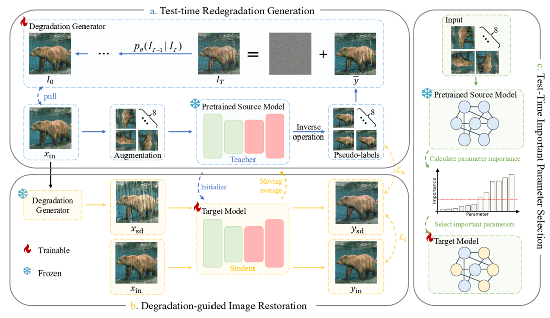 一体化图像恢复(AiOIR)方法在处理多种退化方面已取得了显著进展。然而,当测试分布偏离训练分布时,其性能往往会明显下降。因此,探索面向 AiOIR 的测试时自适应方法具有重要意义。为了在不访问源数据、也不进行重新训练的情况下,使预训练的 AiOIR 模型适应未见过的退化分布,需要解决两个关键挑战:一是设计可靠的伪监督信号,二是稳定自适应过程。基于这样一个观察:同一场景的多个退化版本应当映射到一致的干净图像,本文提出了退化一致性的测试时自适应方法(Degradation-Consistent Test-Time Adaptation, DCTTA)。DCTTA 包含三个核心组成部分:(1)测试时再退化生成,通过基于扩散模型的生成器构建伪退化–干净图像对,以实现分布对齐;(2)退化引导的图像恢复,通过自监督一致性损失实现域自适应;(3)测试时重要参数选择,有选择地更新对退化敏感的参数,从而在保持预训练知识的同时确保自适应过程的稳定性。在多个任务和具有挑战性的分布偏移场景下的大量实验表明,DCTTA 相比当前最先进的 AiOIR 基线方法具有稳定优势,在 Rain100H 数据集上最高可实现 +4.57 dB 的 PSNR 提升。